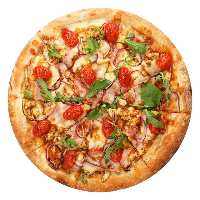 - Ingredients: Tomato sauce, fior di latte mozzarella, parmigiano, bacon, ham, basil, extra virgin olive oil